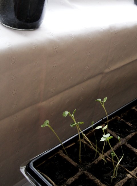 I had hoped I might get by without having to invest in a grow light, as it doesn’t fit well within the new churchmouse budget I’m on. But I will need to replant these hard-working babies a bit deeper, cross my fingers, and wisely start new seeds with more light made available to them. There are ways to innovate, and I like to play. This is trial-and-error, this apartment gardening.