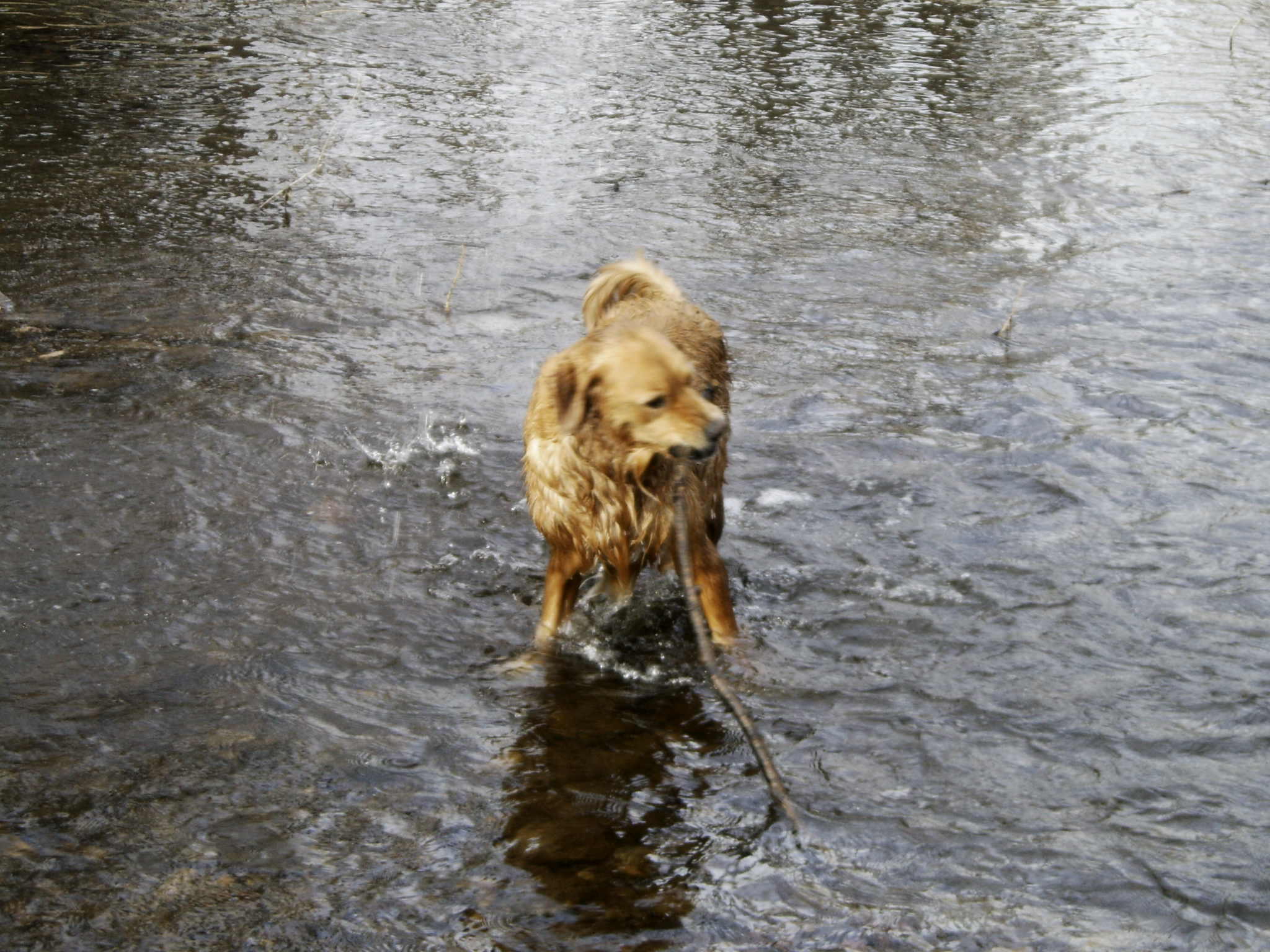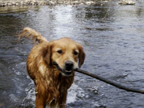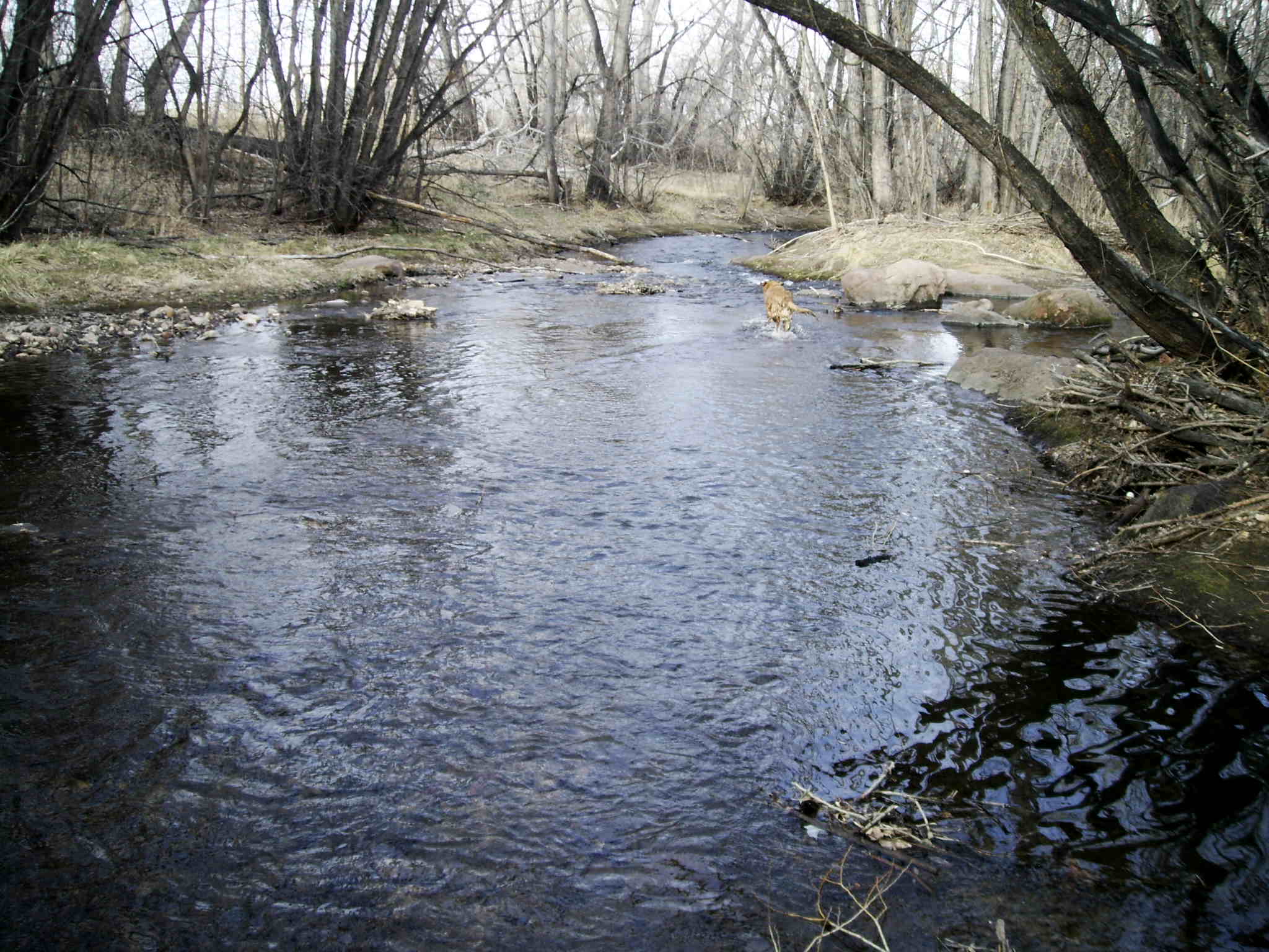 Miss T. does not talk but she does swim. Happily our walk was along a creek, so she she (undeservedly) had the privilege of being let loose from the leash to get in. She generally trots up to her knees at first, pauses, wades around, then goes deeper and lowers her body down. You can practically hear her sigh, “Aaaaah,” as some of us would on a hot August day, or upon slipping into a hot springs after a long hike with sore muscles.