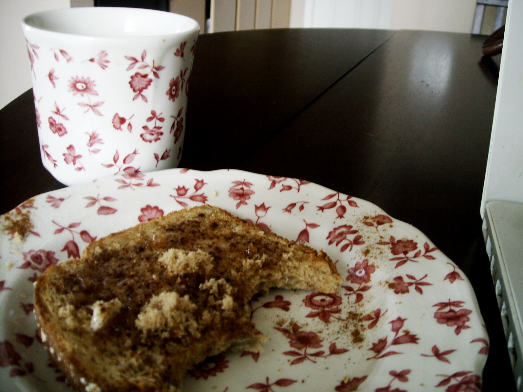 Cinnamon sugar. Butter. These are gifts in my small world. Miss T., do not beg! This is all for me. She knows she will still very likely get the dry corners. Lucky, she is, and a mite spoiled, still she is mine and well and always near.