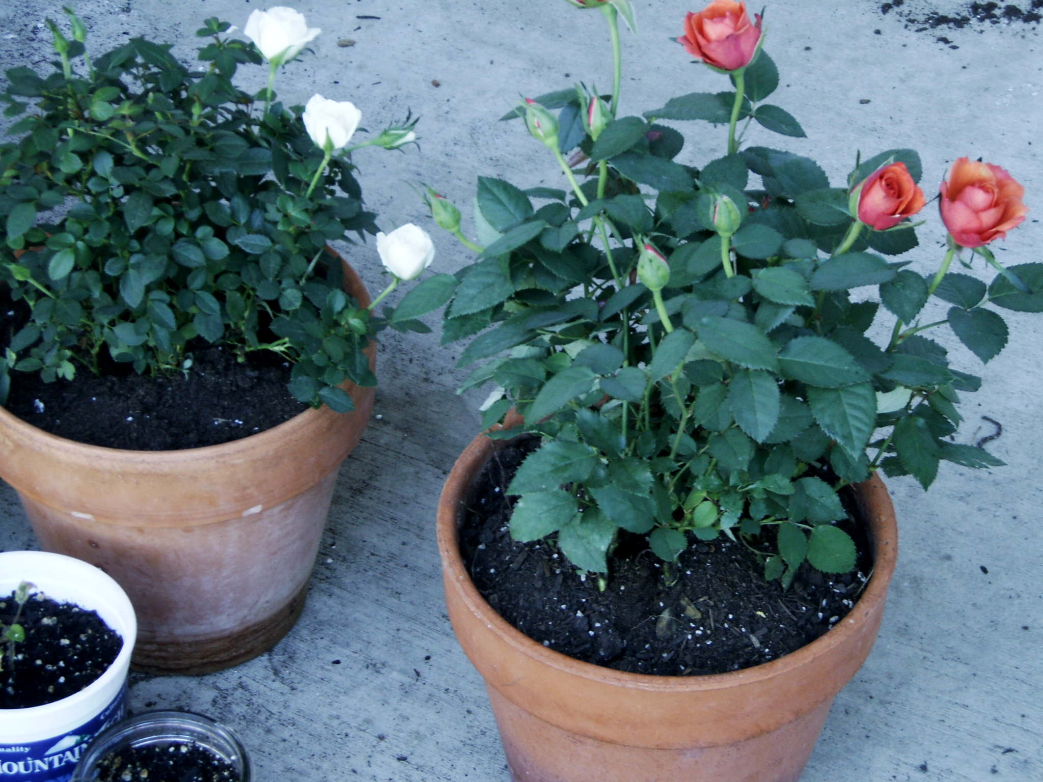 On impulse and self-indulgence (it is my birthday) I bought two mini rose plants. A neighbor moving to a home in the mountains left me three terra cotta pots and so I spent a few moments filling them with the darling new buds, tucking the roots into their new abodes.