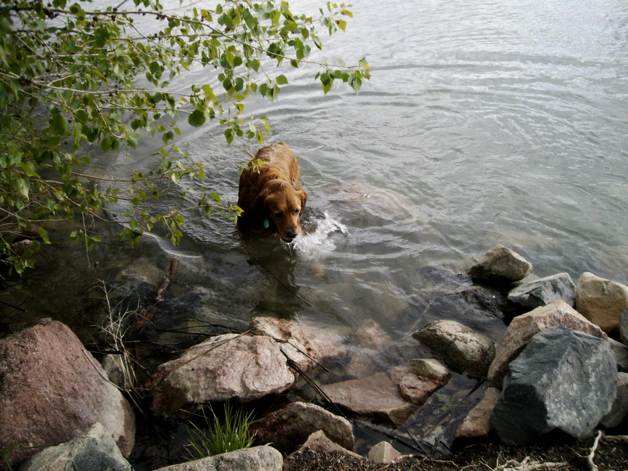 Dogs are allowed off-leash here with the Boulder County sight-and-voice command tags. T. and I have started coming several times a week so she can run and swim, and so I can sit on a rock out in the water and watch as the sun makes evening shadows. Listen as the wind and the trees talk. Smell the water and the weeds.