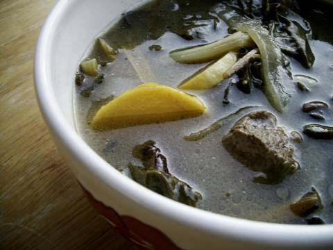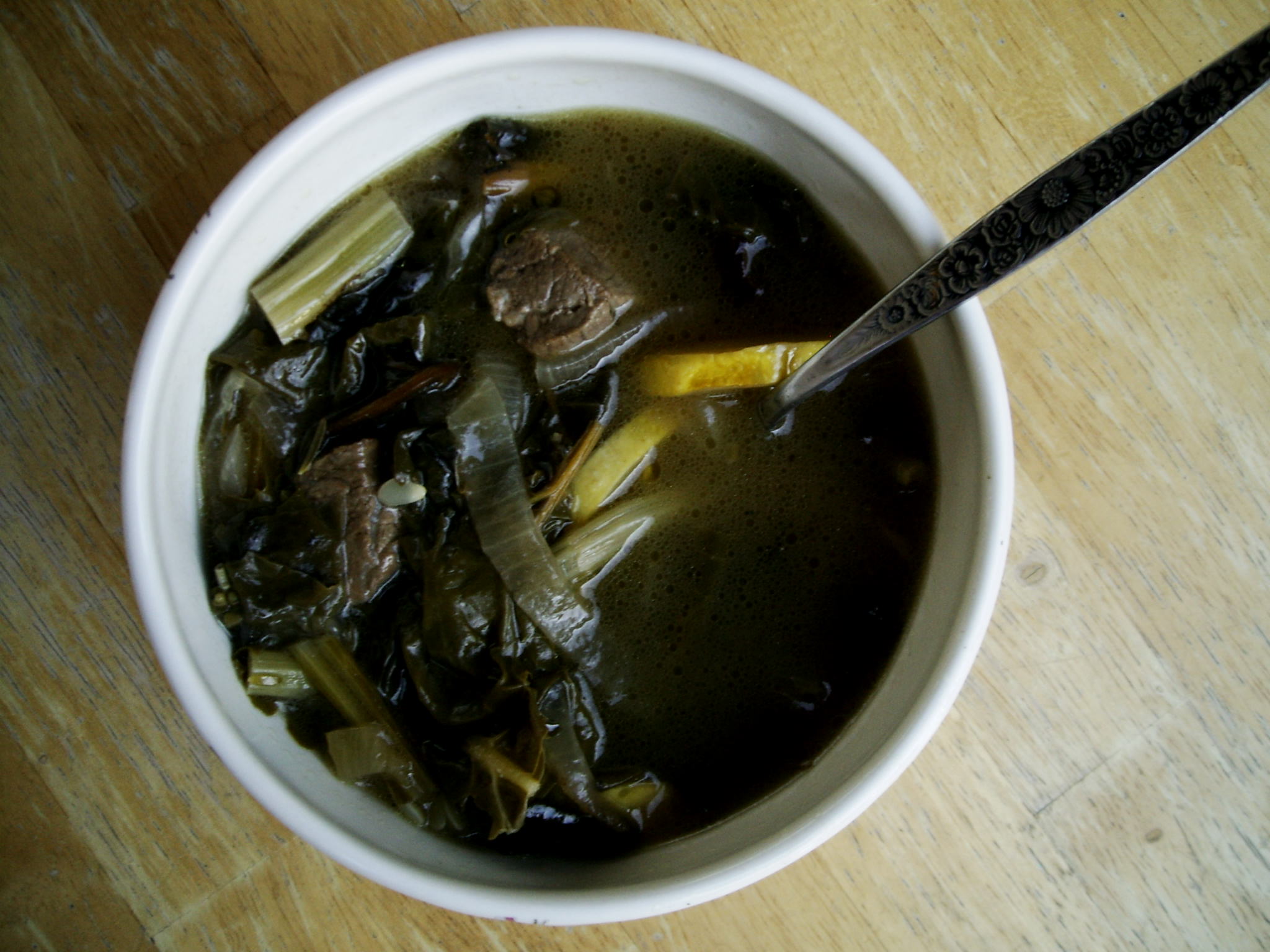 Brown the lamb in olive oil with several cloves of garlic, in a skillet on medium heat. Meanwhile, place butter, onions (sliced into rings), and minced or crushed garlic in a large pot and bring to simmer; heat until onions become clear. Add meat to butter and onions, add about six cups of water, and add rosemary, bay leaves, salt, pepper, and cumin. Add more garlic if you wish – minced, crushed or whole cloves. Let simmer for about 30 minutes. Slice the Swiss chard into 1-inch strips. Add the chard, squash, and basil, and squeeze in the juice from the half lemon. Let simmer until the chard and squash have softened and the meat is tender. I’d recommend tasting the broth periodically and adjusting seasonings as you wish – I found I liked quite a bit of salt and pepper in mine. This would also be good with potatoes added.