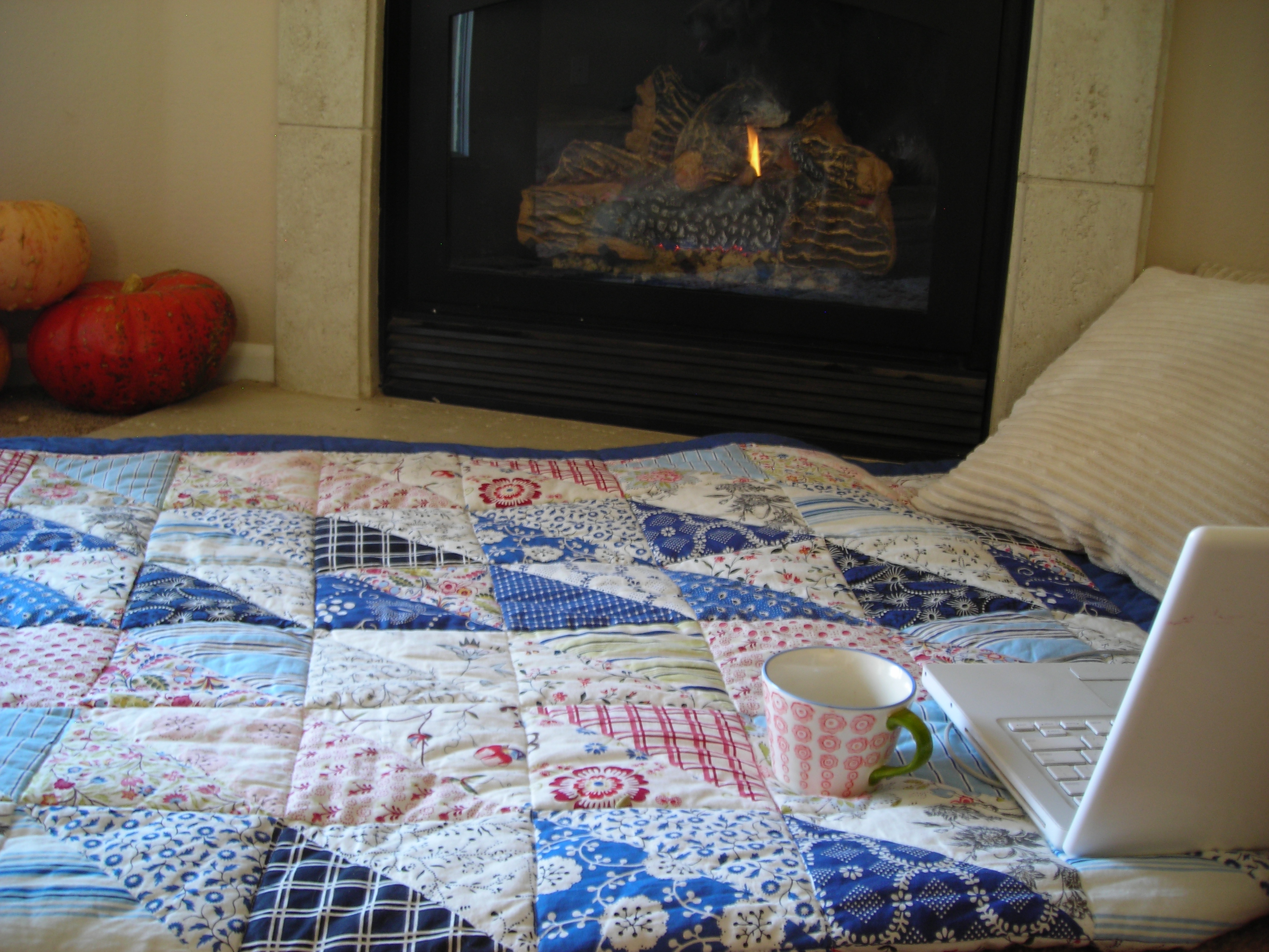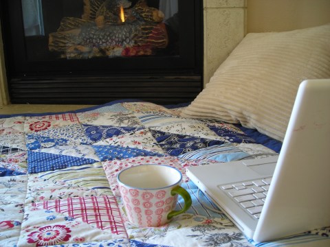 I have yet to attain the dream home with its well-lit studio room or renovated loafing shed. And I rather wish I could be leasing a 100-year-old house or a flat in an old brick building where I might claim unique spots near windows with detailed trim. But I’m currently making the best of yet another cookie-cutter apartment. It’s not perfect, gorgeous, or quaint, but a girl does what she can. Lately I’ve been finding my creative spot on a quilt my sister gave me for Christmas, nestled with cushions in front of the fireplace. Add a cup of coffee and a handful of writing ideas, and I am set.