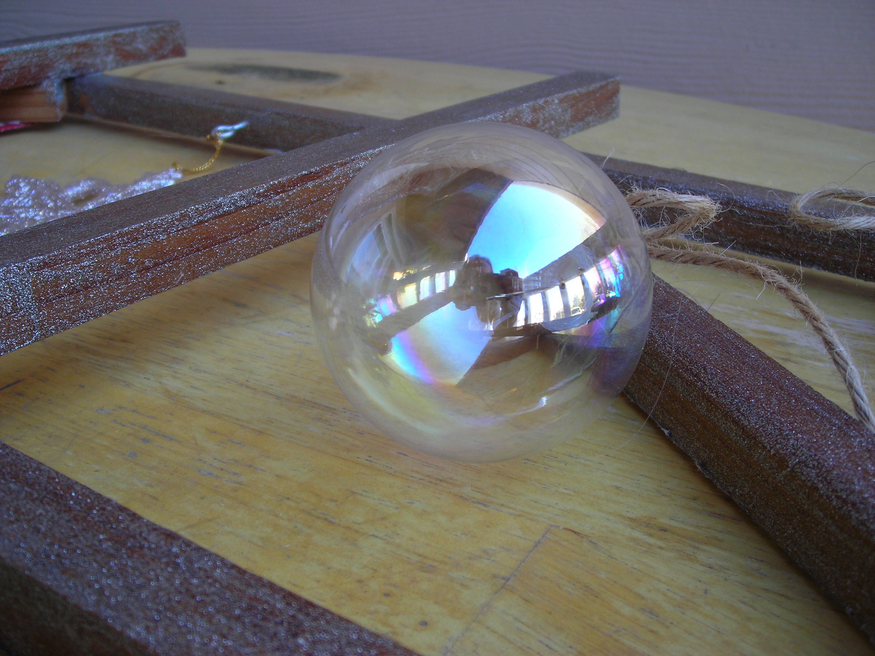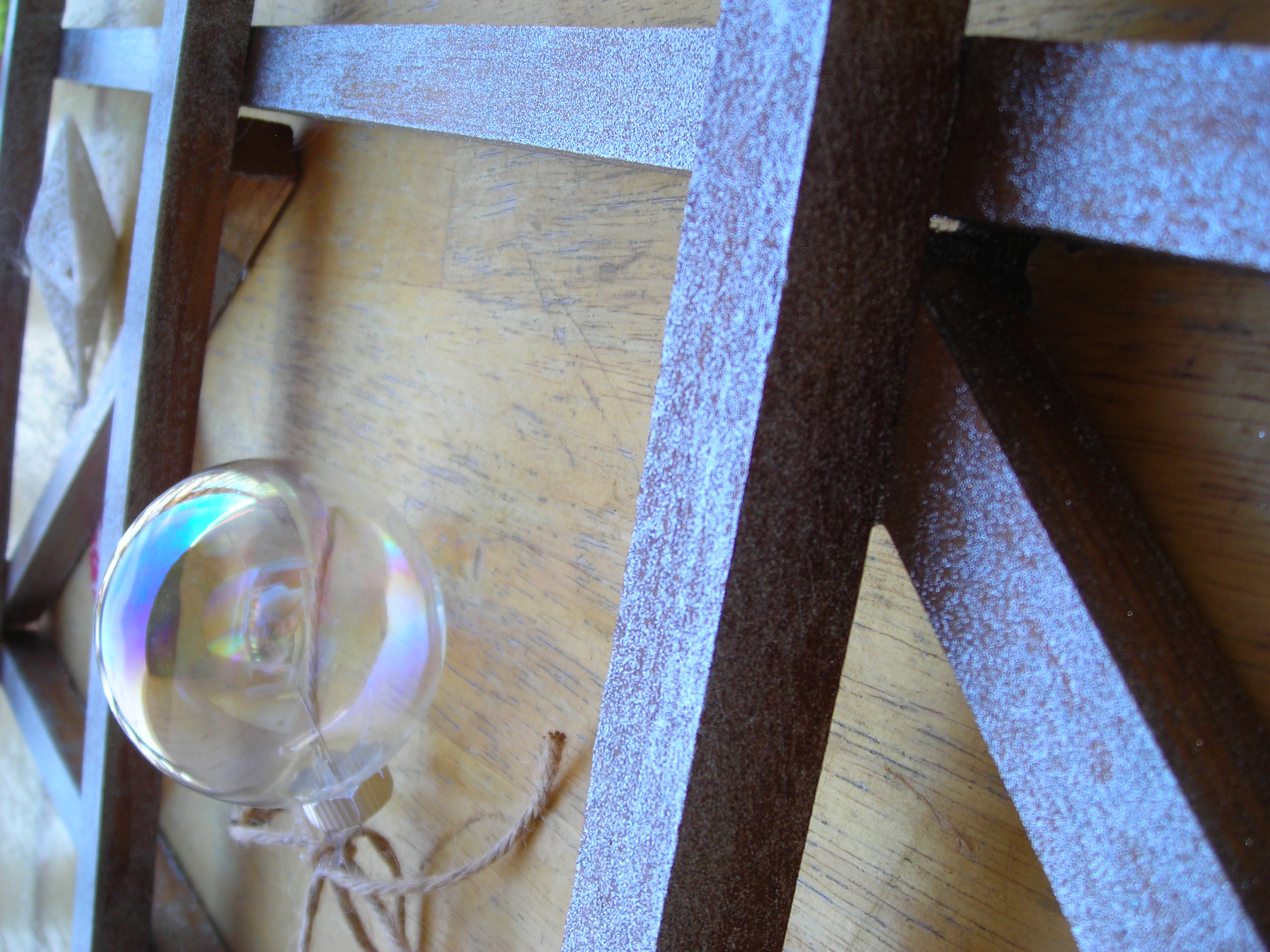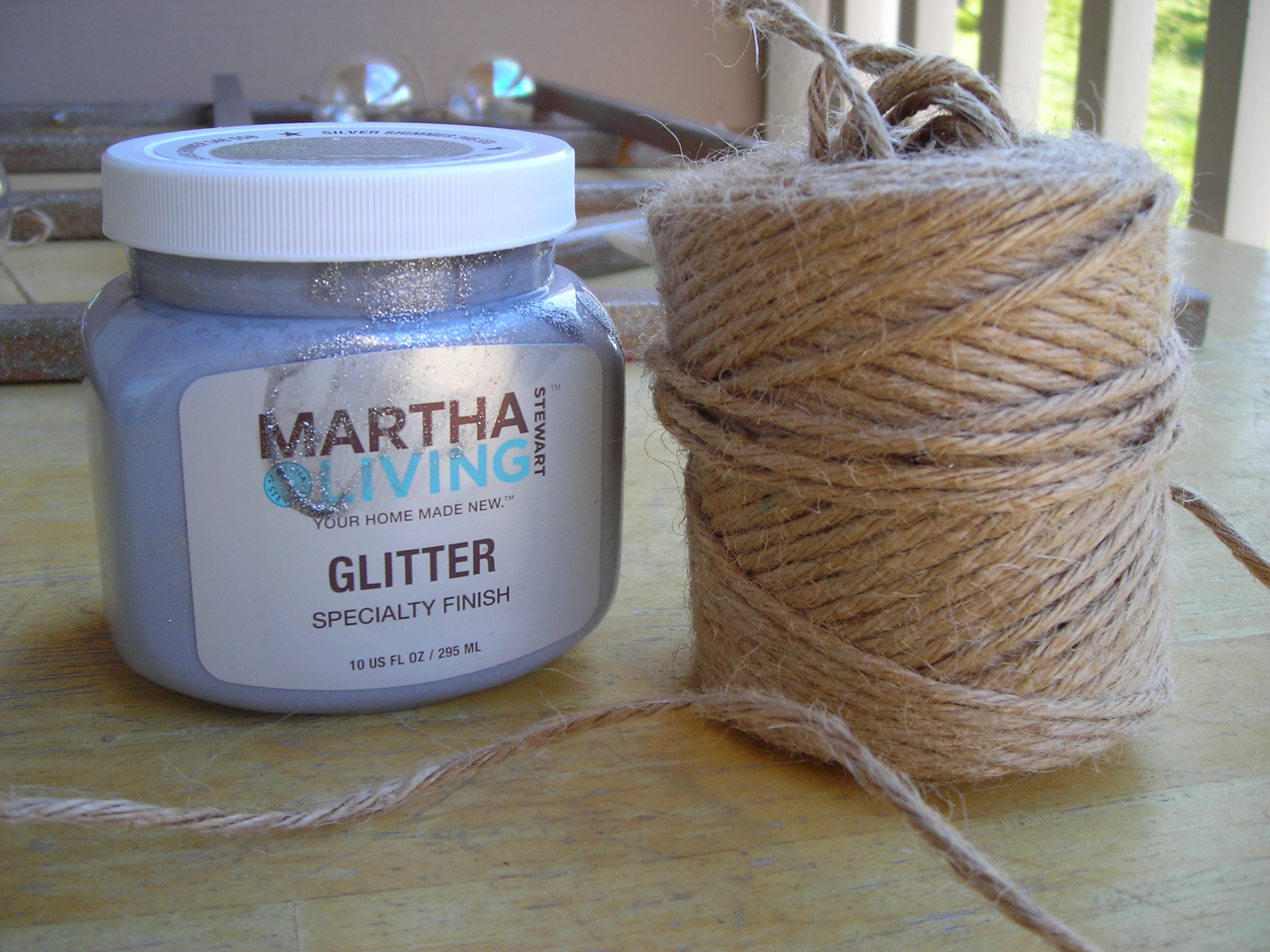 We didn’t have a paneless window frame, but we did have a trellis that I hardly used this growing season and didn’t plan to use again. I sawed off the legs and we painted it with a Martha Stewart silver-blue glitter. Three coats and we had the sparkle we wanted!