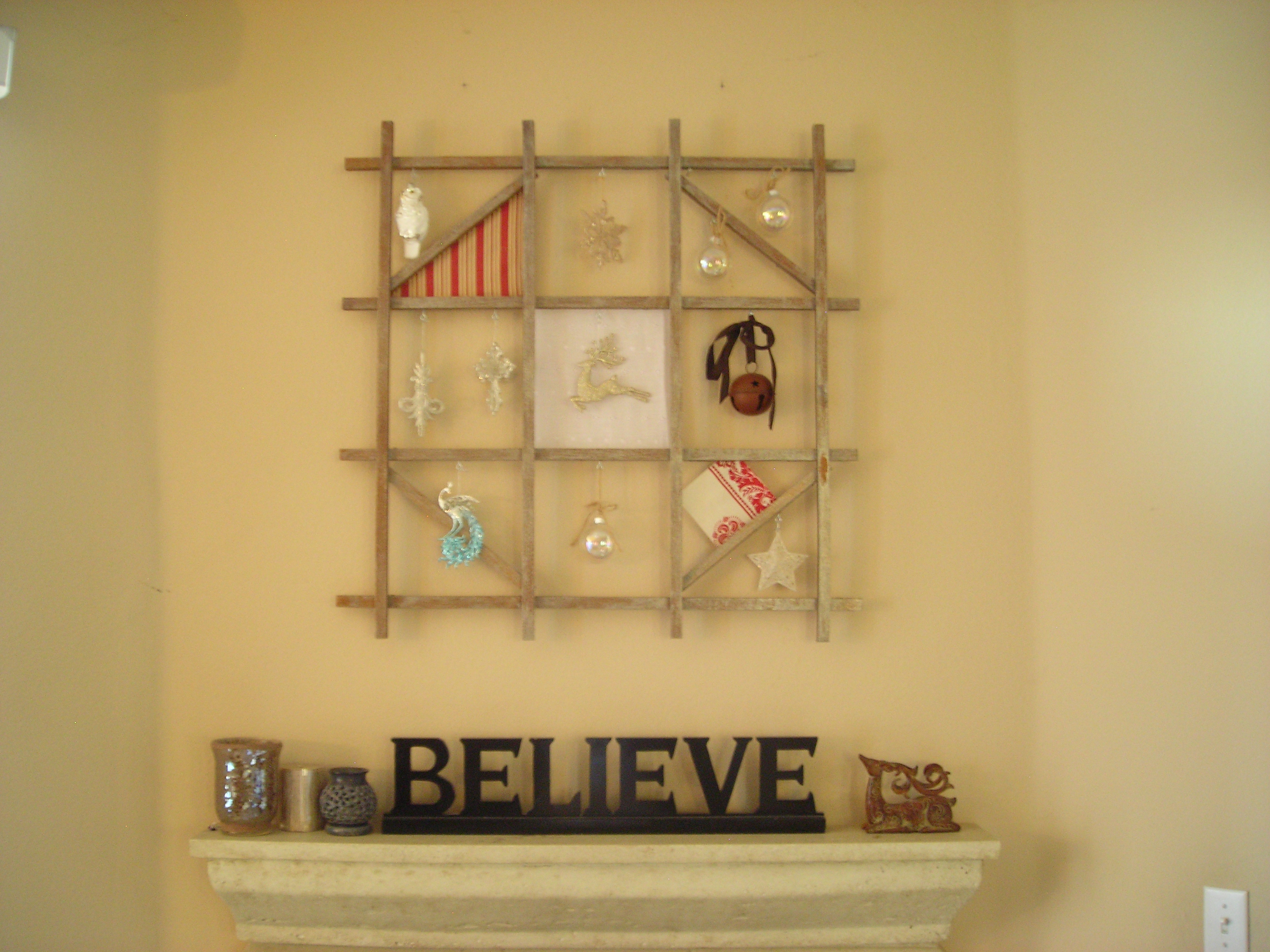 We screwed in the c-hooks (which was harder than you’d think), hung the ornaments, glued the fabrics, and put it all on display above the fireplace.
