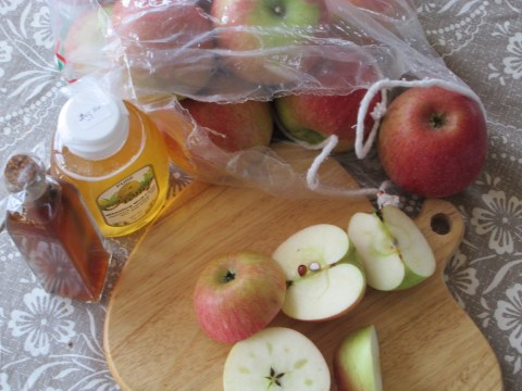 Jar of honey. Cutting board. Hand-picked (by me!) Haralson apples from Whistling Well Farm. And homemade vanilla from my sister and John. Happy kitchen.