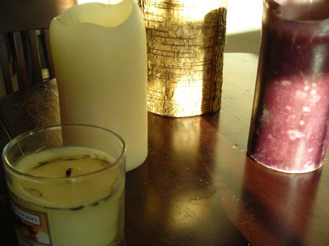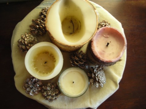 Candles gathered from corners and windowsills, some also in need of scrubbing.