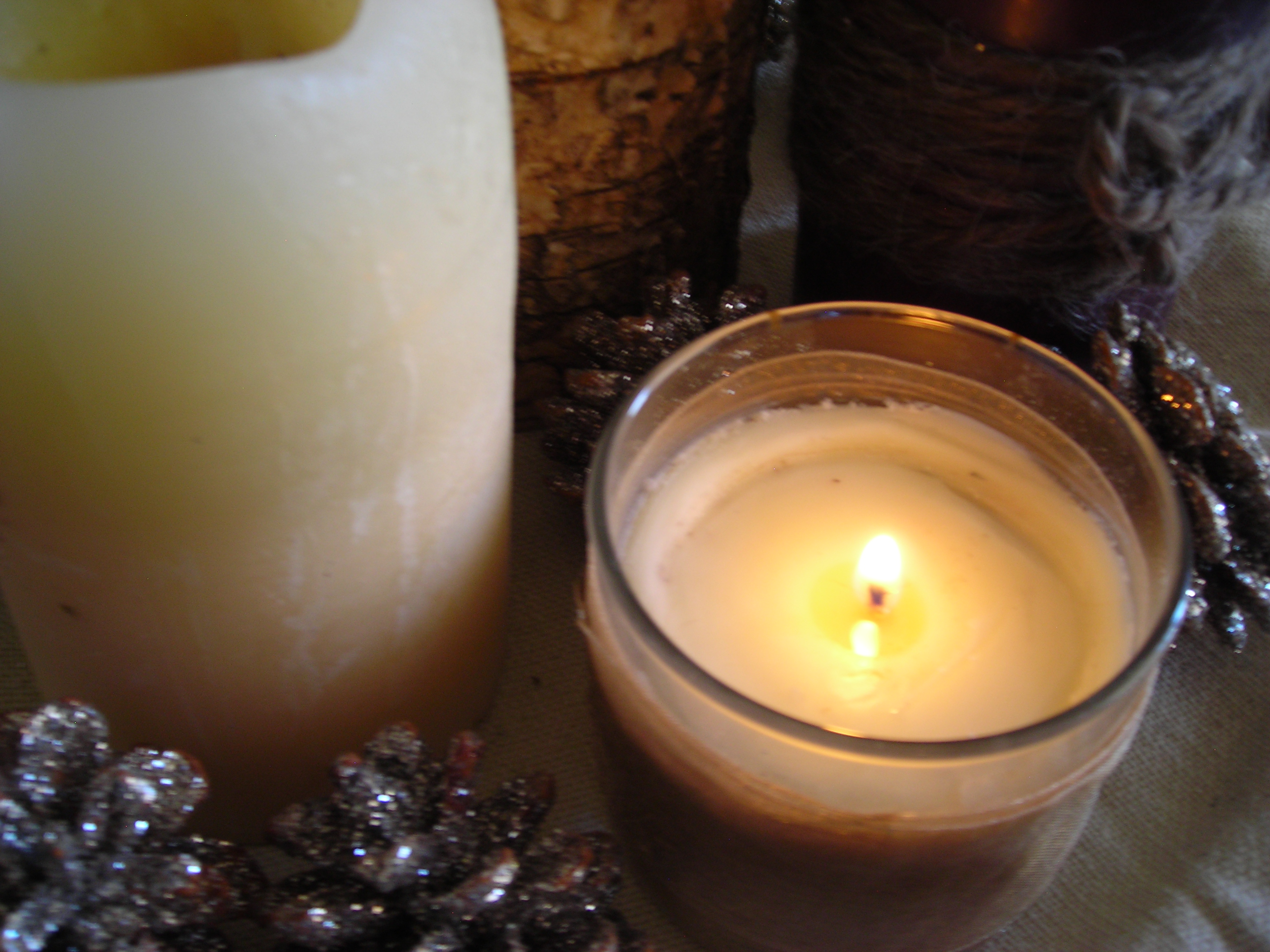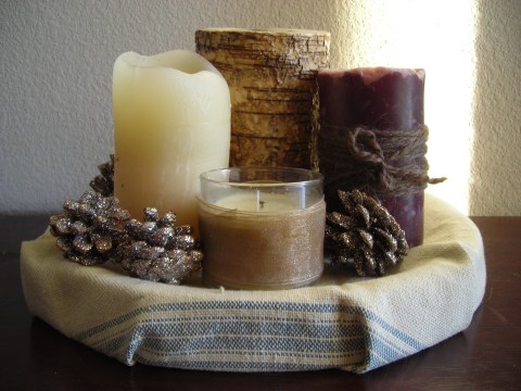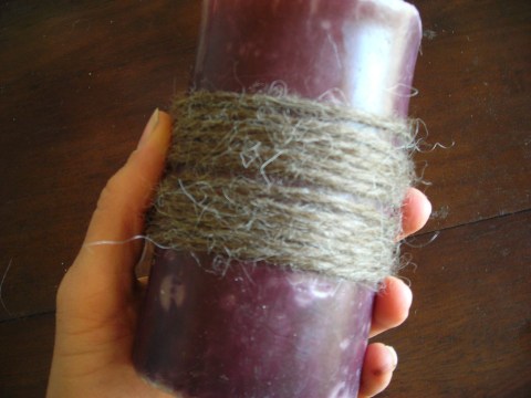 A couple of the candles needed a little sprucing up, so yarn and ribbon helped with that.