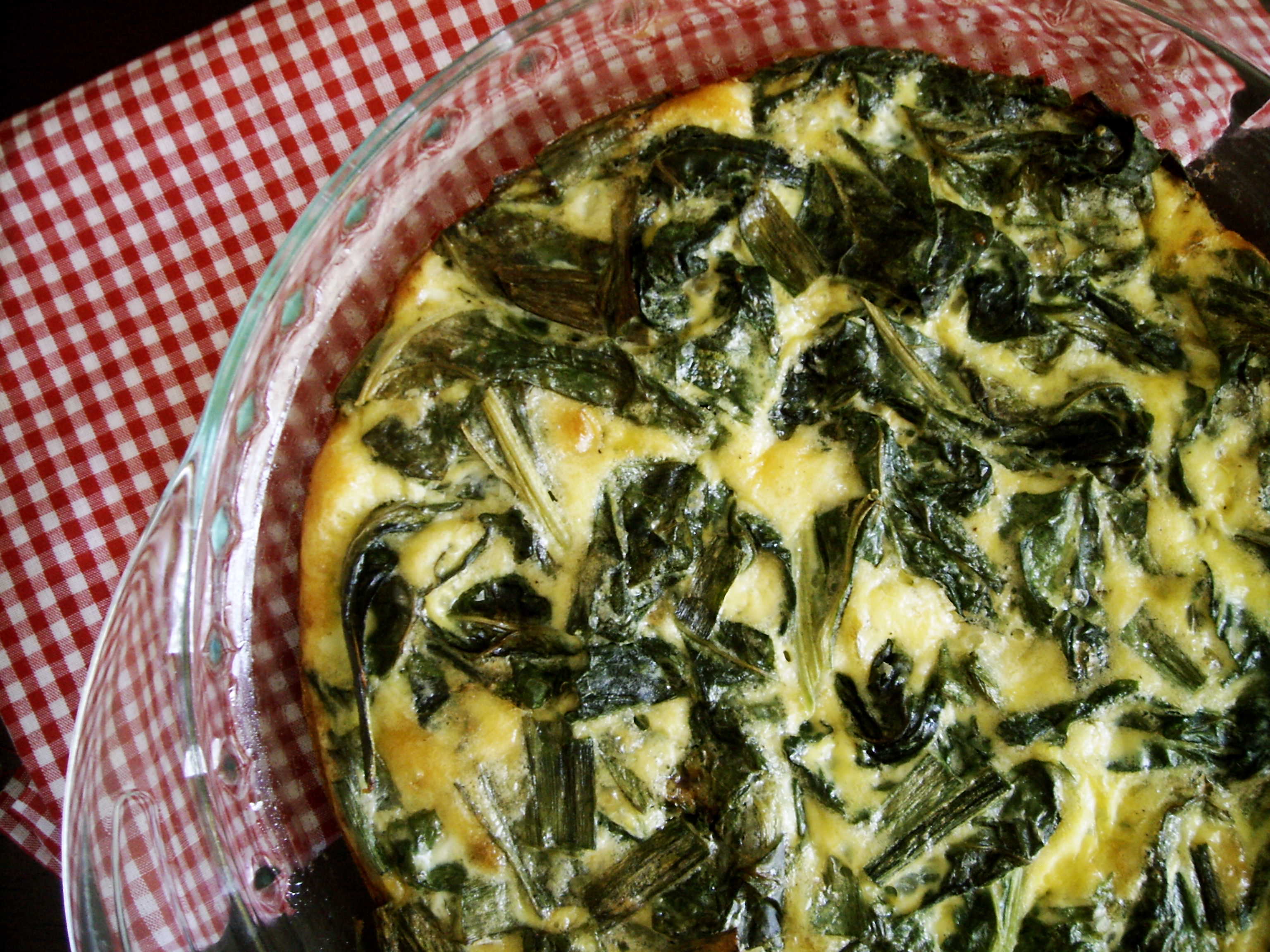 Beat the eggs with the milk. Add the cheese, salt, and pepper. Fold in the greens and bake in a preheated oven at 350 degrees for 40 minutes.