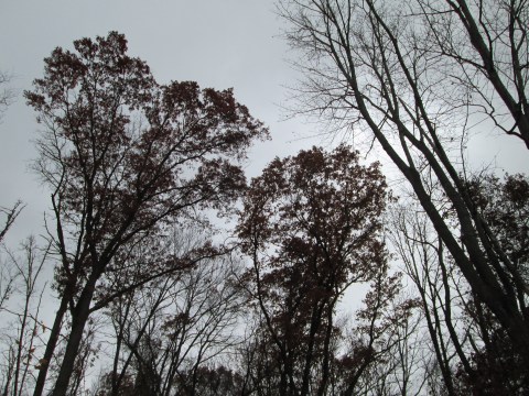 The sky stayed gray-white-blue today in the cover of clouds, until night fell and hid them away. On our walks through the woods, the lines of the tree trunks draw my eyes upward, to where I can see the silhouettes of the trees’ crowns against whatever color the sky happens to be. Today I found myself centered beneath several trees whose fine, small, tip-of-their-fingers branches reached out and overlaid one another, multiple times, so that above me I saw a kind of cobweb, or lace, hung in that space, woven of wood. I wish I could describe it for you better, all those black lines crossing so delicately over one another, so clearly defined against the white of sky. You would understand why there are stories of dryads. You would understand why humans are compelled to create art, tulle-lush tutus, tapestries, linens with fine embroidery, filigree. We want to be of such things, to re-speak them, to be connected with them somehow.