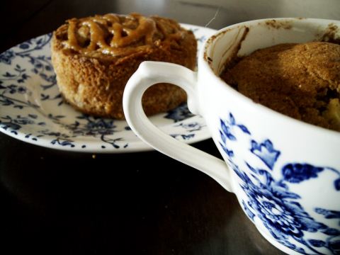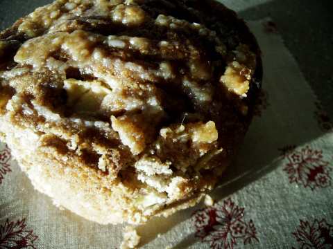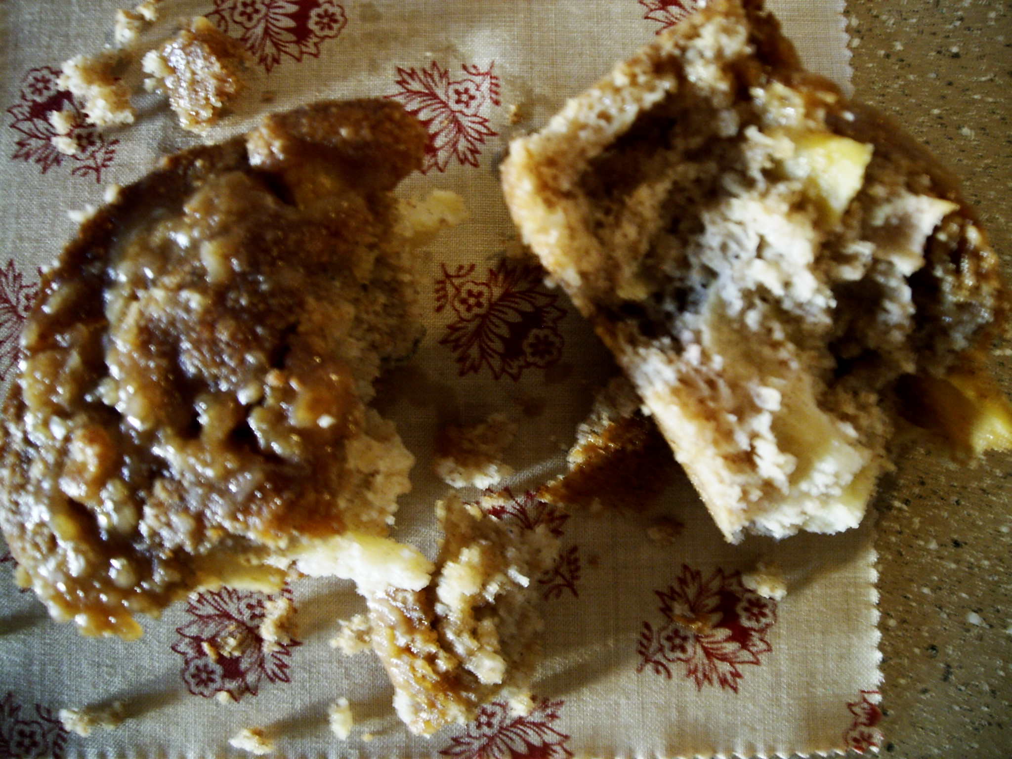 And they turned out! Lots of apples held together with just a little flour. Eaten warm it’s like apple pie in a muffin. Which is best for the days (nearly all, for me) when you must run out the door to work, and grab breakfast on the way.