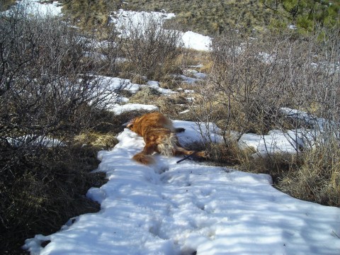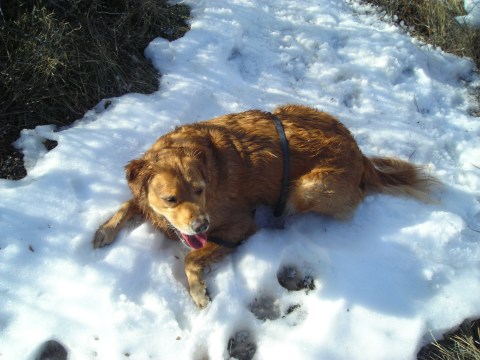 We found a few patches of snow where T was able to cool down. She panted from the weight of her winter coat and working against gravity. She snorted and rolled in and ate the snow for relief.
