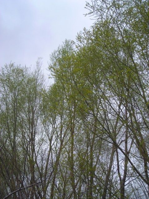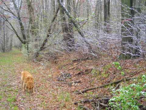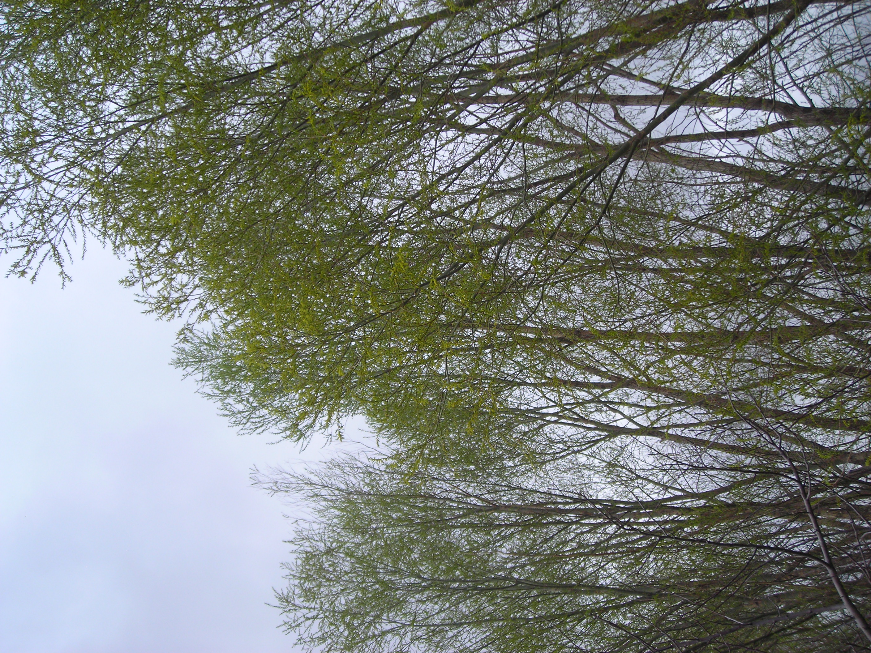 The buds keep coming forth. The leaves brush around my feet. The dogs rush back and forth, sniffing branches, finding animal carcasses, carrying sticks around with personal pride. The sunlight flickers through the trees and falls into patterns on the ground like a kind of intangible lace.