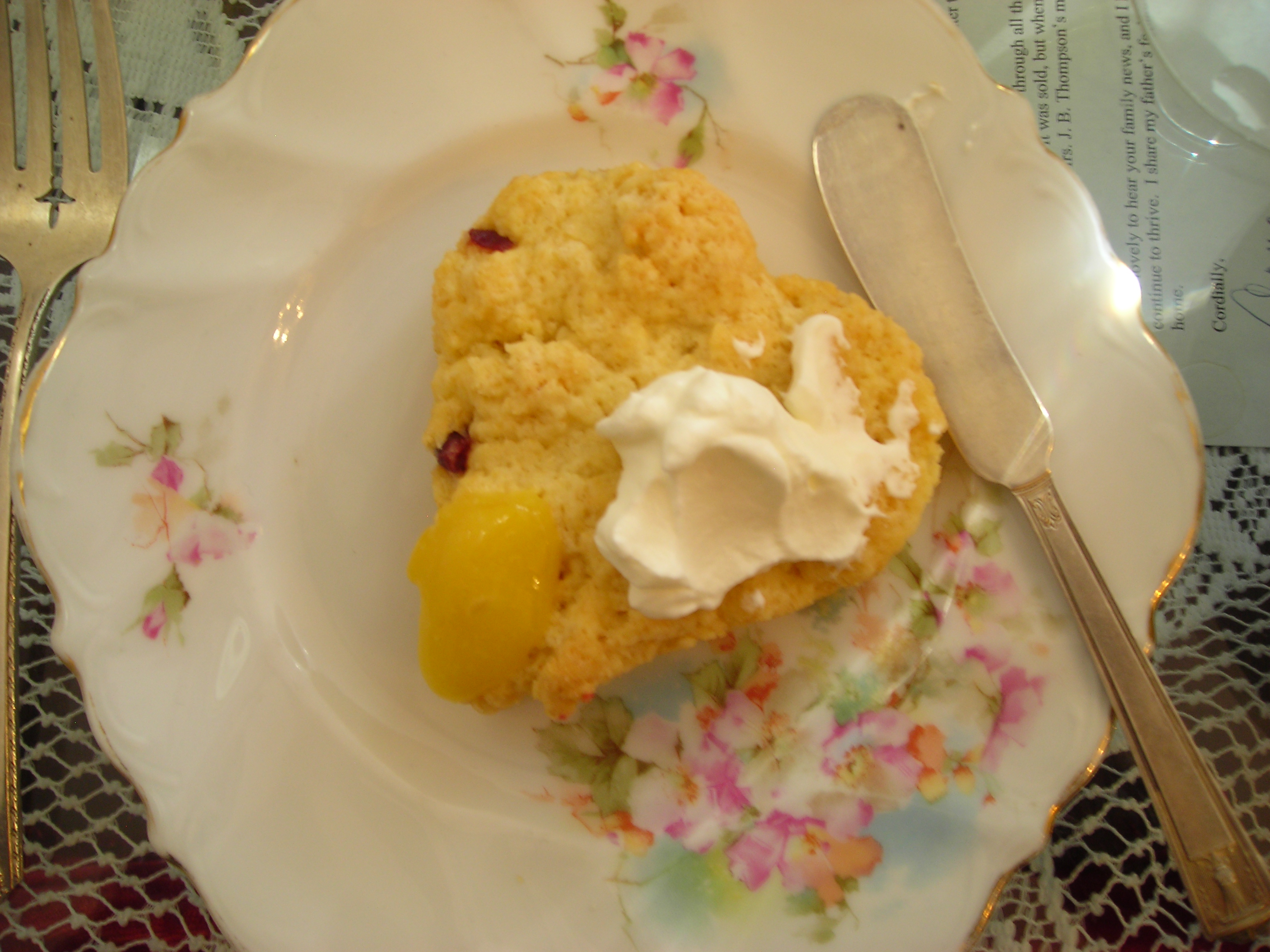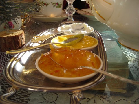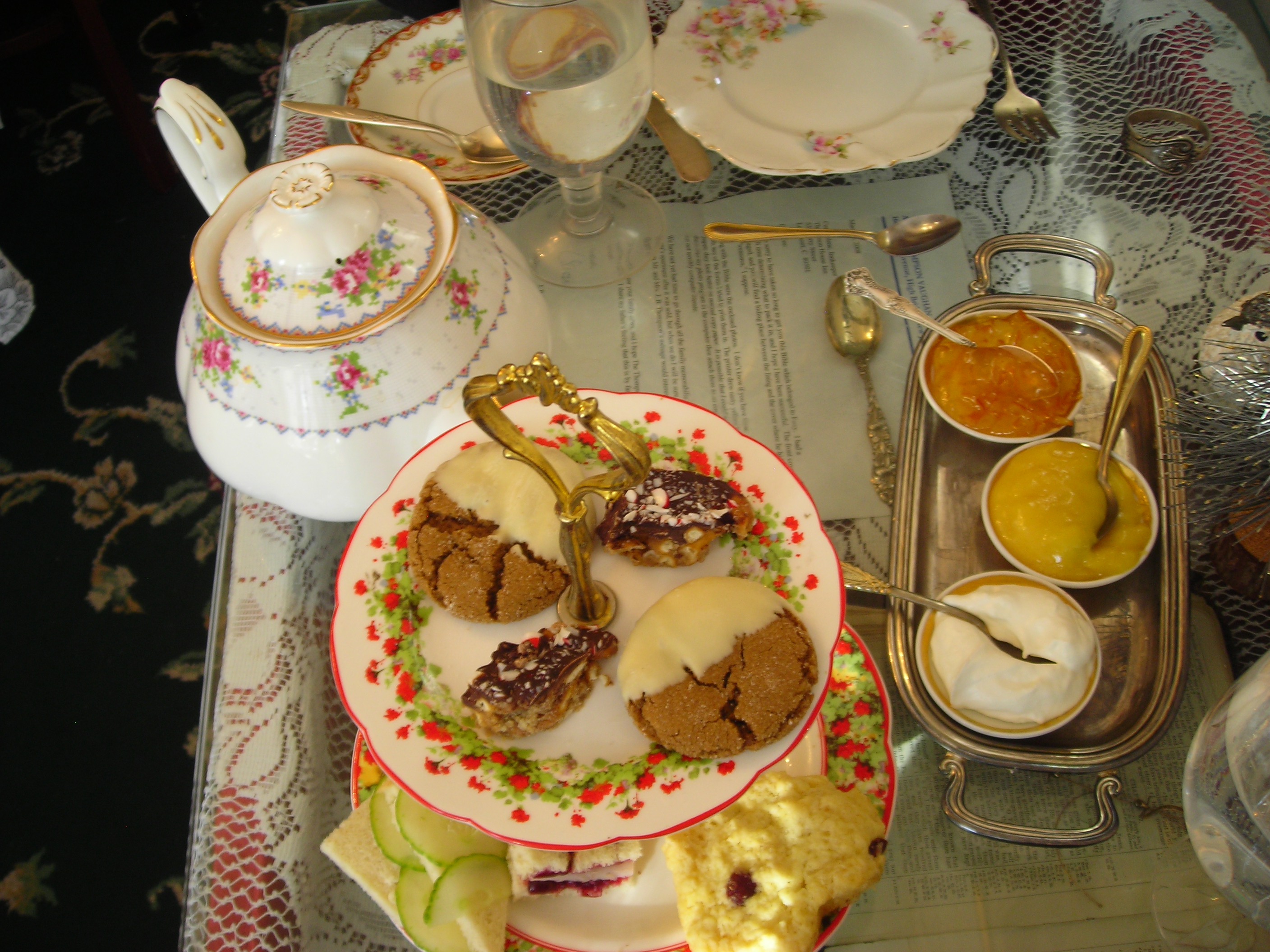 Napkins in laps, we were ready to have our cream tea. The orange tea came in a classic pot along with cucumber sandwiches, turkey on cranberry-sauce bread, heart-shaped scones, and gingersnaps. And one mustn’t forget the pots of lemon curd, cream, and orange marmalade. Scrumptious.