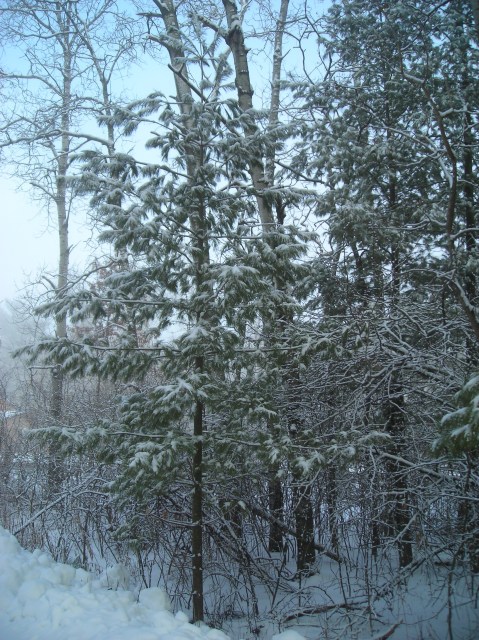 The rest of the year we are giddy about the spring buds opening into flower, the broad and flickering deciduous leaves, the fall colors. But in winter, the pines and firs and spruces get their fair due. While the other trees make striking silhouettes with their naked branches, the evergreens bring color onto our landscape. They make us look at them; we want to look at them. And even better when they catch snow, to sparkle under the light of sun or moon.
